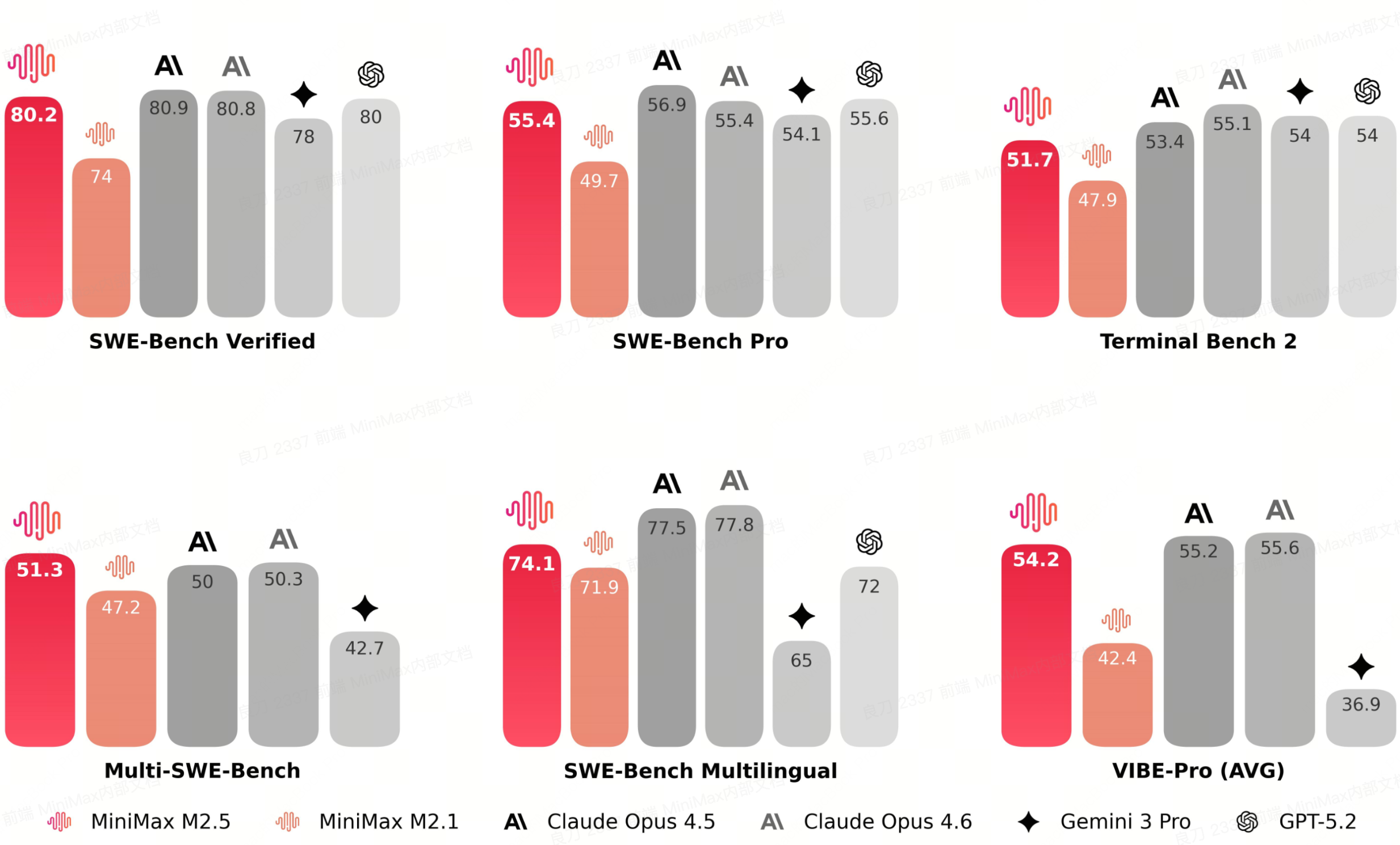 M2.5 has reached the level of tier-one industry models. On the multilingual task benchmark Multi-SWE-Bench, M2.5 achieved the best performance in the industry.