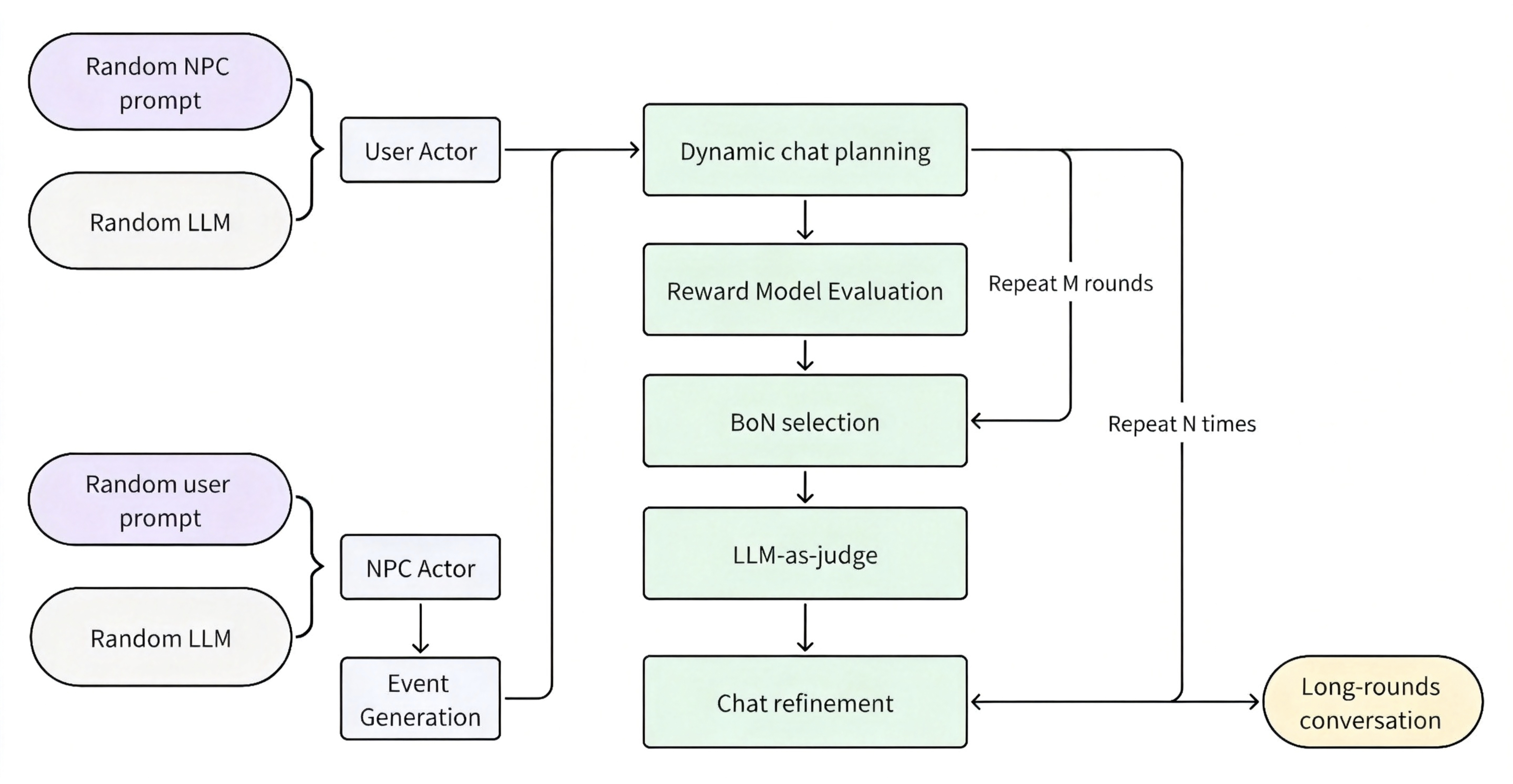 • We have the selected expert models to act as NPC and User to generate multiple candidate chat turns based on the current synthesis state. Instead of blind generation, we employ a Dynamic Chat Planning Module. This planner inserts control prompts into the context, guiding the conversation's direction and emotional tone.