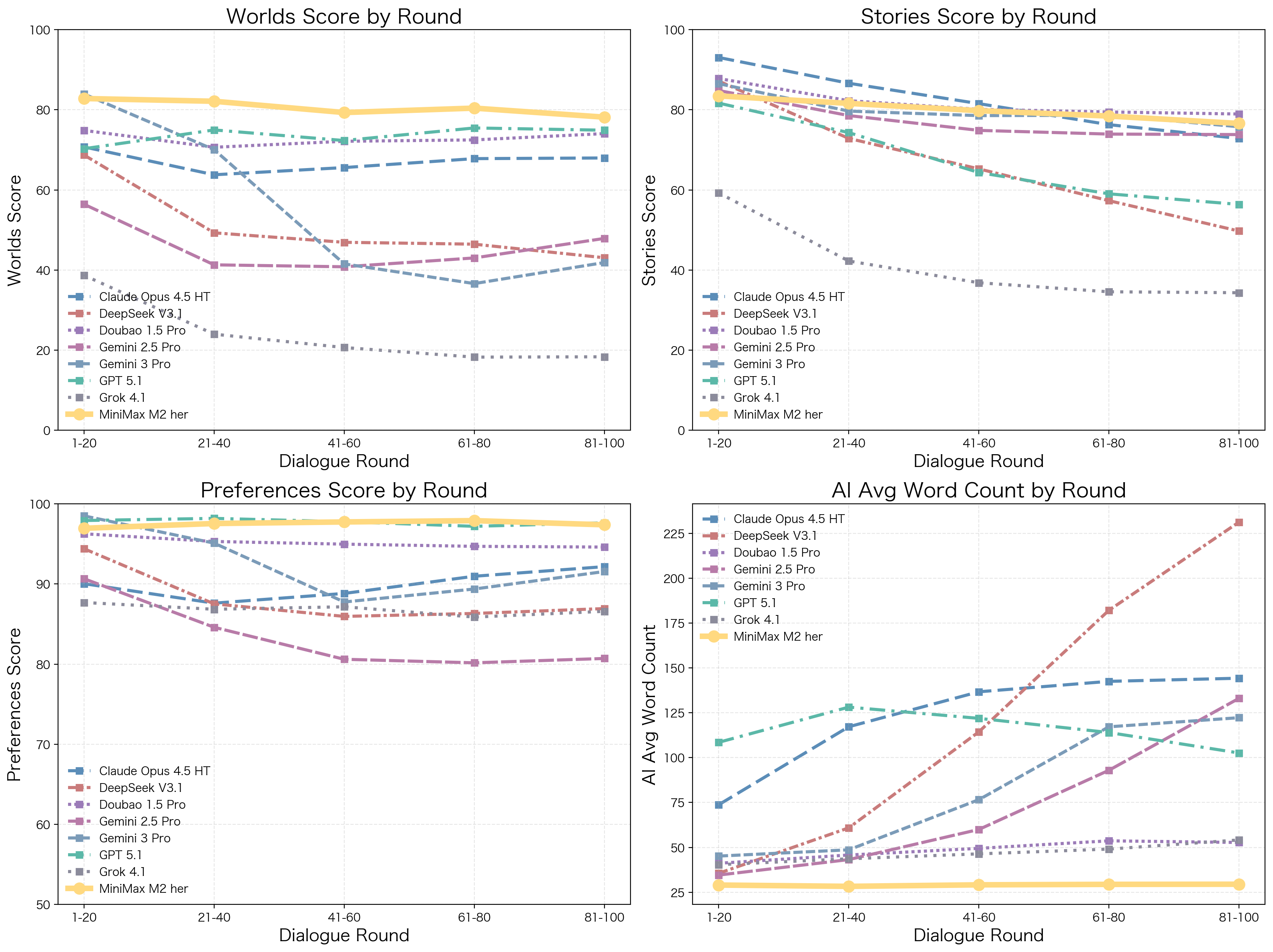 • Long-range quality stability: Most models hit a "performance wall" after turn 20—basic writing quality degrades, and plot momentum drops precipitously. Critically, these models often suffer from "context bloat," progressively generating longer and longer responses to compensate for lost focus. These bloated outputs inevitably contain more logic gaps, creating a compounding cycle of negative experiences as the conversation deepens.