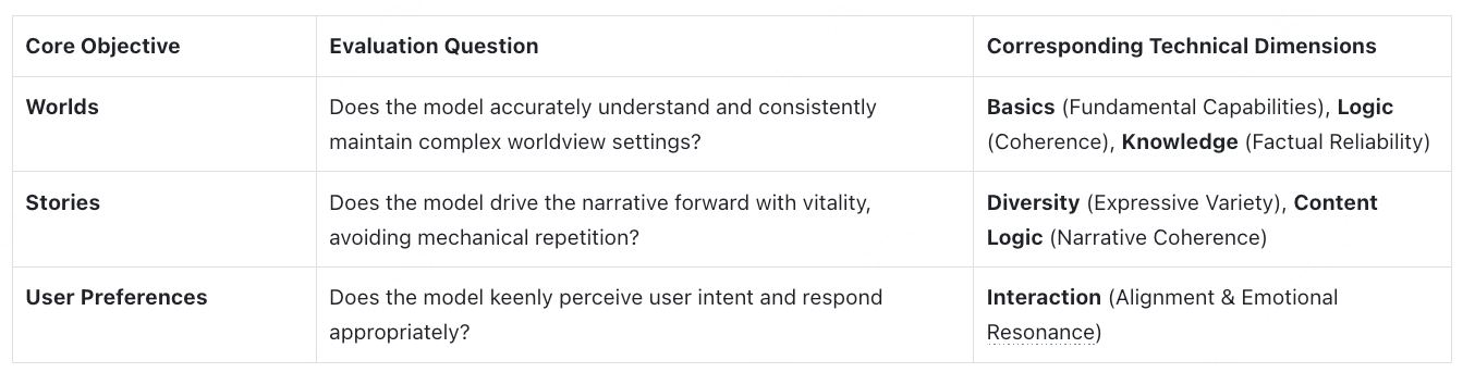 Translating our "misalignment" philosophy into practice, we mapped our three core pillars—Worlds, Stories, and Preferences—to specific failure modes. We do not just look for "good" responses; we rigorously hunt for the specific flaws that break immersion.