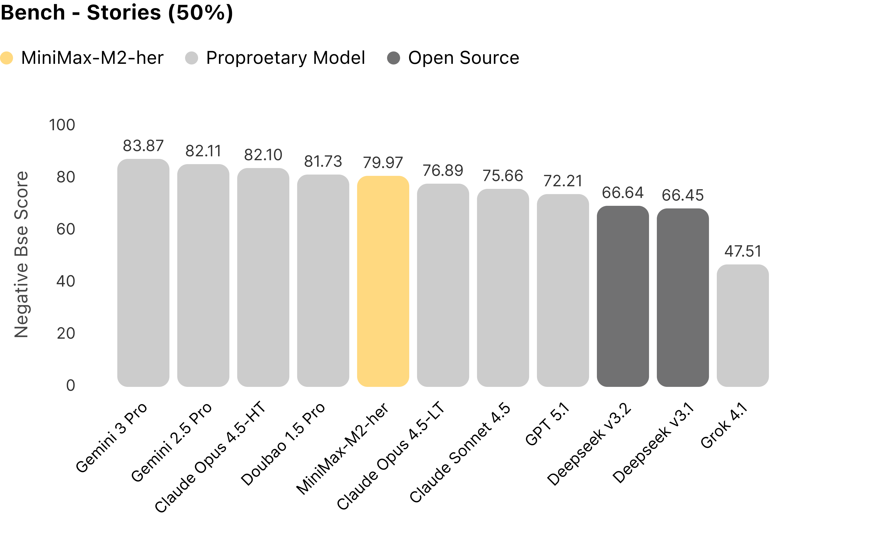 On the Stories dimension, MiniMax-M2-her ranks fifth among all models, still achieving a relatively high standard. Gemini excels in rich vocabulary, Claude steadily advances the plot, and Doubao delivers vivid expressions. In comparison, MiniMax-M2-her tends to maintain expressive diversity while adopting a plain and natural language style.