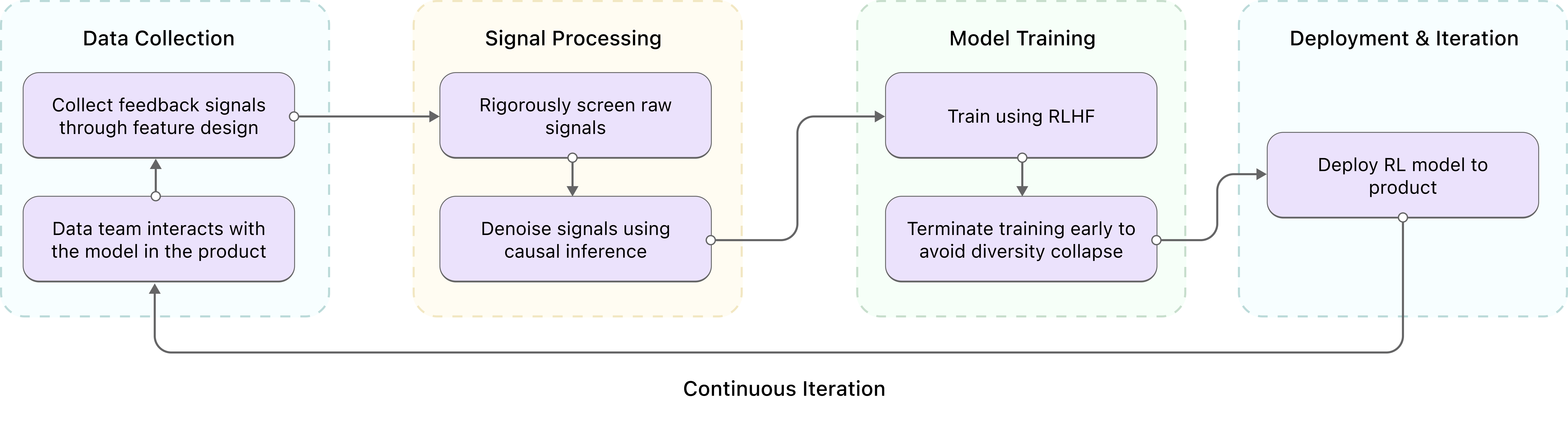 • We then train the model on the refined signals using RLHF. We apply early stopping to prevent models from "reward hacking", which commonly causes the collapse of generation diversity.